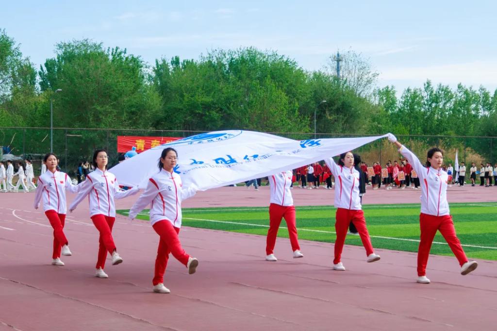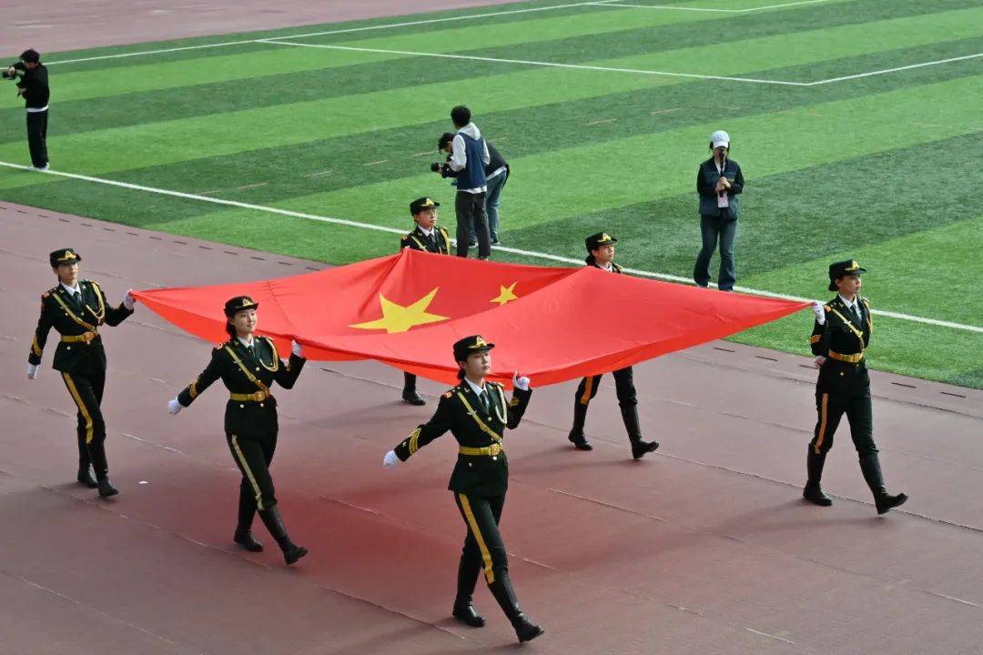 开幕式上,国旗方阵率先亮相,护旗手步伐铿锵。校旗方阵中旗帜翻飞间,忠诚团结的信念深入人心。旗林方阵红旗翻涌,“财经报国,金融强国”的口号响彻云霄,昭示着中财大人的使命担当。